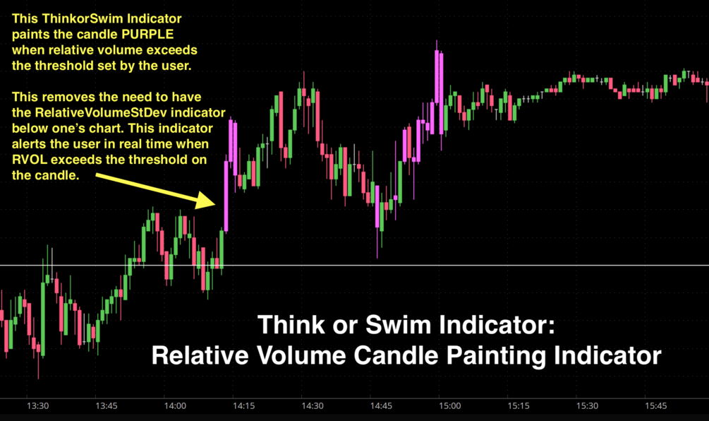 The Relative Volume Candle Painting Indicator paints the candles PURPLE in real time whenever Relative Volume exceeds the threshold the user sets. For example, when relative volume exceeds a 2.0 standard deviation. It looks like this: